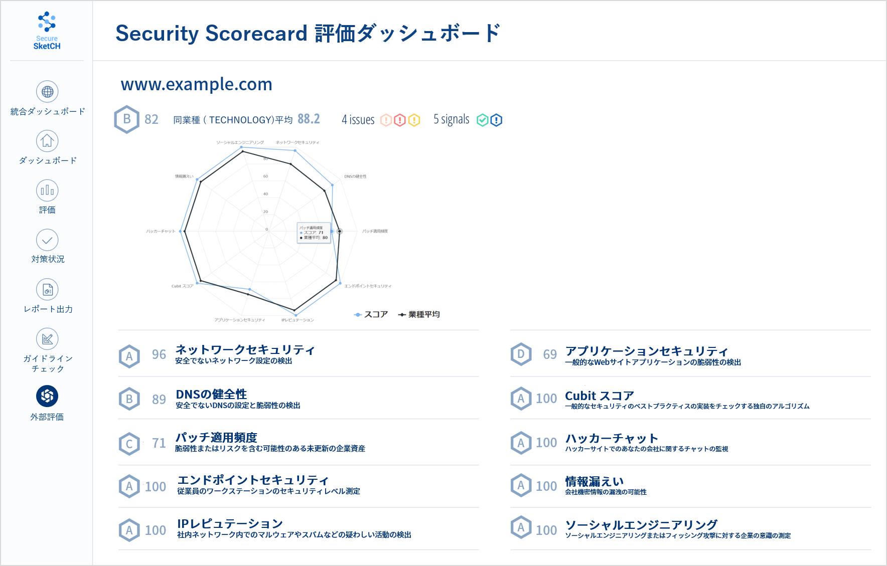新機能は、担当者が設問に回答する必要はなく、外部評価の結果がスコアとして自動的に算出・更新されます。Secure SketCHの内部評価結果と同一画面で随時確認できるため、セキュリティ業務の効率化・高度化を実現します。